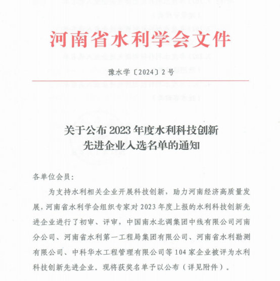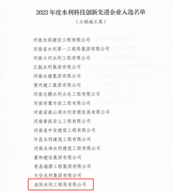 洛陽水利工程局有限公司榮獲河南省2023年度水利科技創(chuàng)新先進企業(yè)稱號
